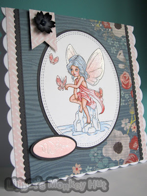I cut a panel of the Egg patterned paper from an Echo Park pad called Celebrate Easter and glued this to the base card. I doodled a boarder around this with a thin black liner pen. I die cut the image panel using a Double stitched Oval Die from My Favourite things. Over this I also added a die cut cloud edge panel using swiss dot bazill card. I tied some red twine around the card and added a little butterfly charm. I then also added a few little resin butteflies and stamped "Happy Easter" using Lawn Fawn Harolds ABC stamps to finish the card off.